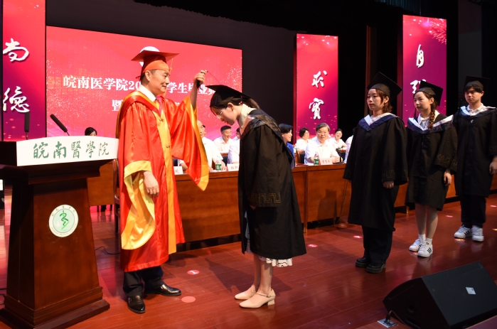 毕业生代表,病原生物学专业硕士研究生方瑜同学,临床医学专业本科毕业生陈瑞同学先后发言。他们表达了对母校的诚挚谢意和惜别之情,表示将谨记母校校训,继承和发扬皖医精神,心有理想,情怀家国,以实现中华民族伟大复兴为己任,为祖国医疗卫生事业的发展,为人类身心健康奋斗终生,不辜负母校的培养和期望。