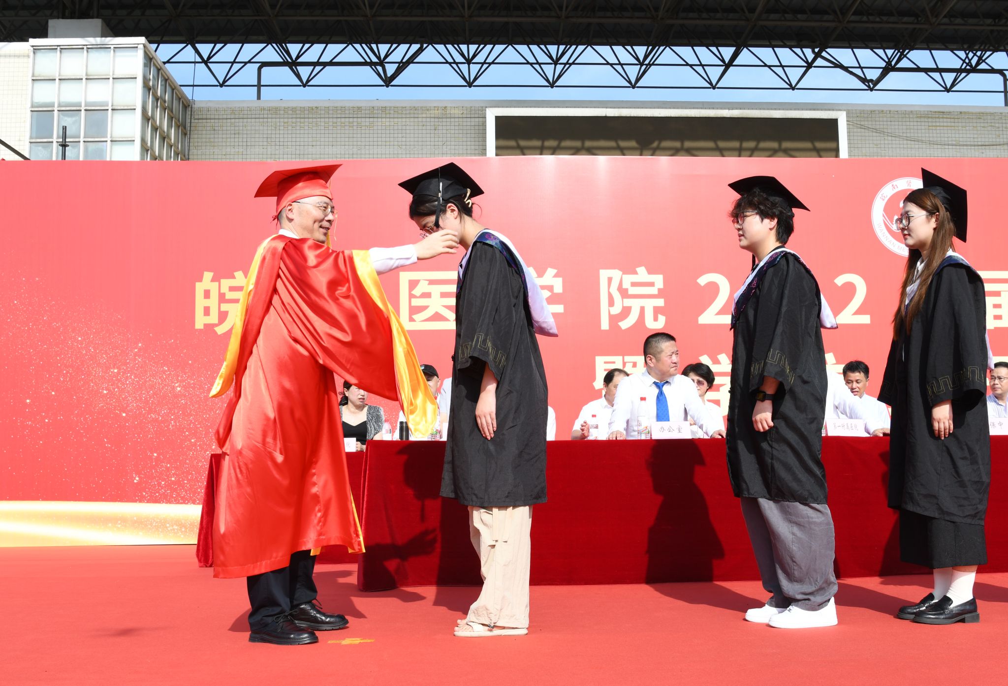 姚应水以“带上‘锦囊’ 卸下‘包袱’ 奔赴远方”为题发表了饱含深情的讲话。他代表学校向圆满完成学业的全体毕业生表示祝贺,向辛勤培育、悉心教导的老师和父母们表示感谢。姚应水回顾了同学们与皖医共同成长的心路历程,充分肯定了同学们在求学路上的耕耘、沉淀和收获,并向毕业生送上四样“锦囊”:一是带上永不褪色的远大理想,胸怀“国之大者”,将个人理想融入时代洪流,在民族复兴的壮阔征程中,刻下属于2025届的荣光。二是带上永不冷却的人文温度,苦练医学技术,传递医者温度,温暖他人、照亮世界。三是带上永不止步的探索精神,永葆对知识的好奇、对探索的热忱,让学习成为一种生命习惯。四是带上永不改变的真挚祝福,将师生情、同窗情保存心间,化作未来征程上的星光,从中汲取力量。同时,他希望同学们卸下“包袱”,丢掉焦虑、丢掉浮躁,在未来人生的道路上深耕细作,行稳致远,书写无愧于时代、无愧于青春的壮丽诗篇。