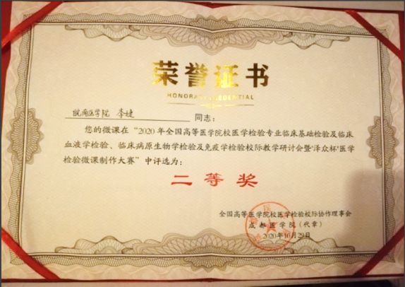 来自全国60多所高校的200余名代表参会。会议前半部分为全国医学检验界的知名专家就国内疫情防控下以及新时代、新医科背景下,检验医学学科建设与教育改革、课程思政建设以及线上资源开发和利用等方面的热点、焦点问题分享了宝贵经验和思考。会议后半部分为线上优秀课程和微课制作竞赛,全国40多所医学院校的100多个作品参加了比赛。经过线上评选和专家评委会的现场评比,我校选送的三个作品均取得了优异的成绩,陶香林老师的线上教学优秀课程案例《微生物及临床检验》获竞赛二等奖,李婕、黄建军老师选送的作品《临床隐球菌检验》和《II型超敏反应的机制与检验》分别获得微课制作大赛二等奖和三等奖。会议期间,通过参会单位投票选举,我校还成功入选全国高等医学院校医学检验专业校际协作会临床病原生物学检验及免疫学检验专业学组常务理事单位。