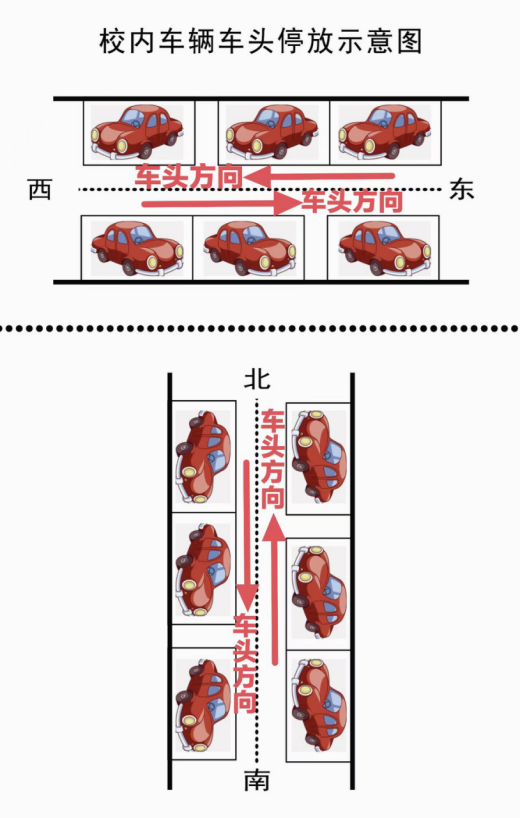 四、强化校园车辆停放与充电管理。机动车辆和非机动车辆须有序停放至指定区域,严禁占用消防通道、人行道、绿化带。所有机动车辆原则上应在停车位有序单边顺向停放 (附图),禁止跨车位停车、越出标线停车;校外、业务合作单位人员机动车辆,不得在校园内过夜停放;电动自行车充电须在专用充电桩进行(自行关闭报警器),严禁在建筑物内、楼梯间、走廊等公共区域充电或停放。
