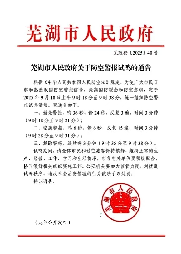 根据《中华人民共和国人民防空法》规定,为使广大师生了解和熟悉我国防空警报信号,提高国防观念和防空意识,学校将按照芜湖市统一部署,于2025年9月18日上午9时18分至9时38分进行校园防空警报试鸣。现将《芜湖市人民政府关于防空警报试鸣的通告》(芜政秘〔2025〕40号,见附件)转发给你们。试鸣期间,请广大师生保持镇静,维持正常的教学、科研和生活秩序。